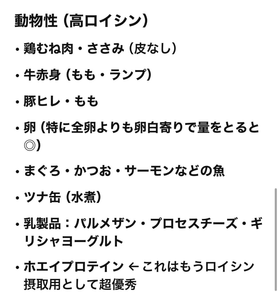 ロイシンを豊富に含むタンパク源を選ぶこと。