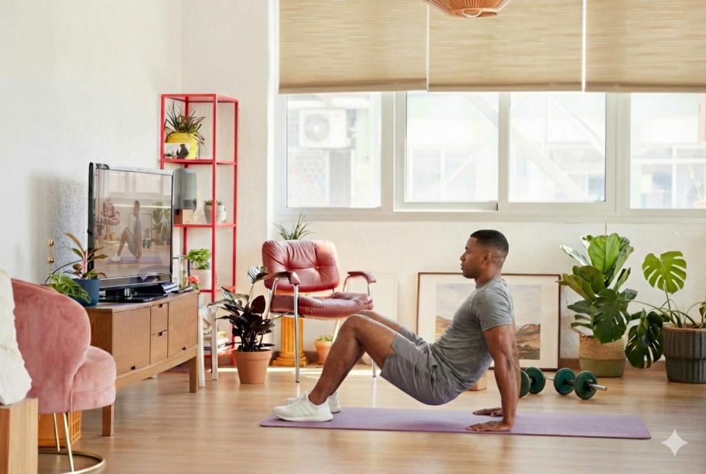 - 基本姿勢: お尻を浮かせ、足は膝を曲げるか伸ばして(きつい場合は膝を曲げると負荷が下がる)前に出す。