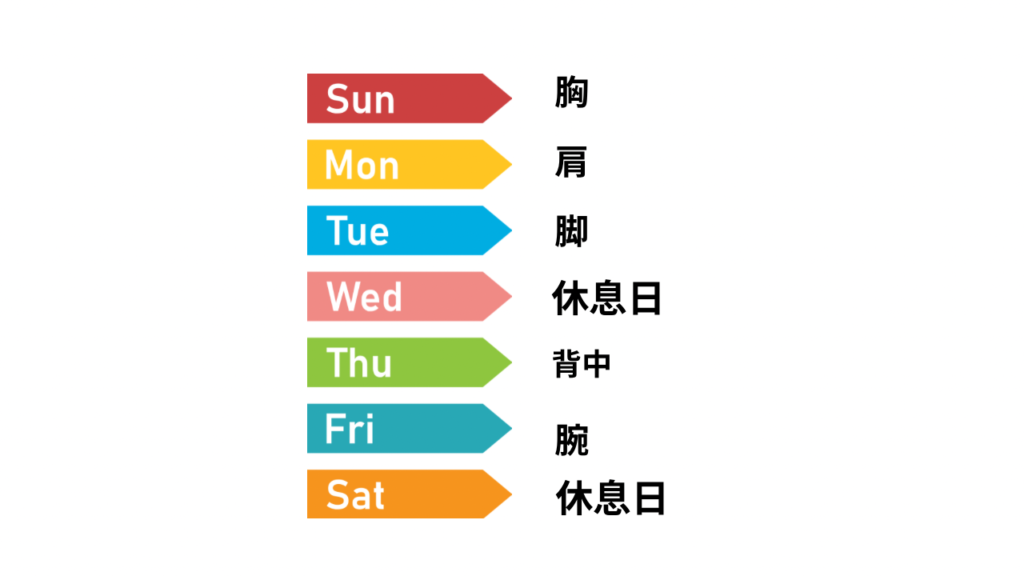 よくある「上半身押す日・引く日・脚の日」に分けた
